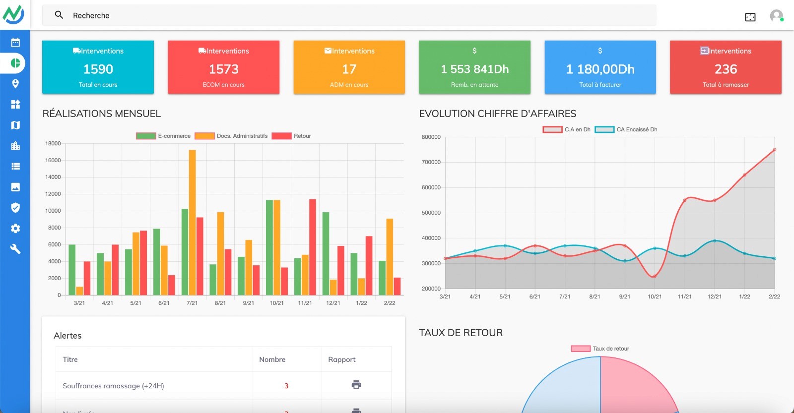 Le tableau de bord offre une vue claire sur nos activités et nos performances. Idéal pour suivre les équipes en temps réel. On identifie rapidement les zones à améliorer et on optimise mieux nos tournées.